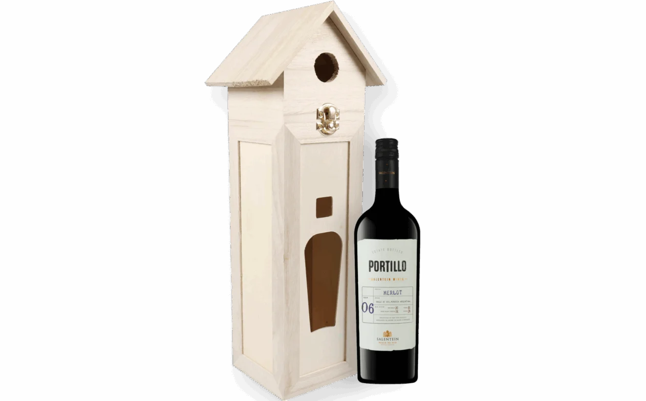 - Individueel verpakt in een houten wijnkist en daarna gezamelijk verpakt in een omdoos inclusief vogelhuisje